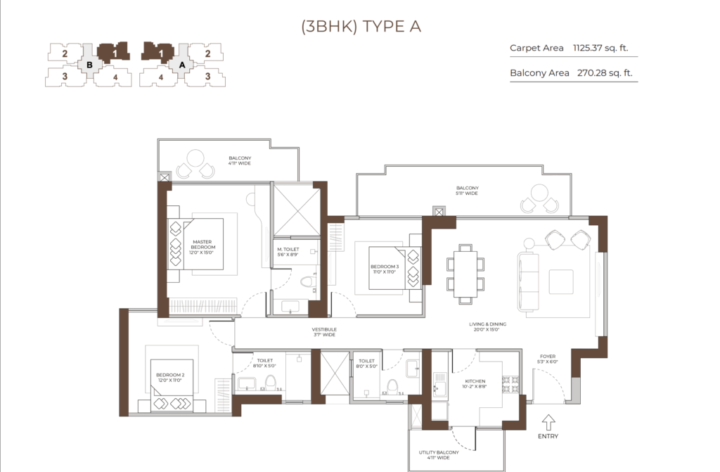 3 BHK + Utility: